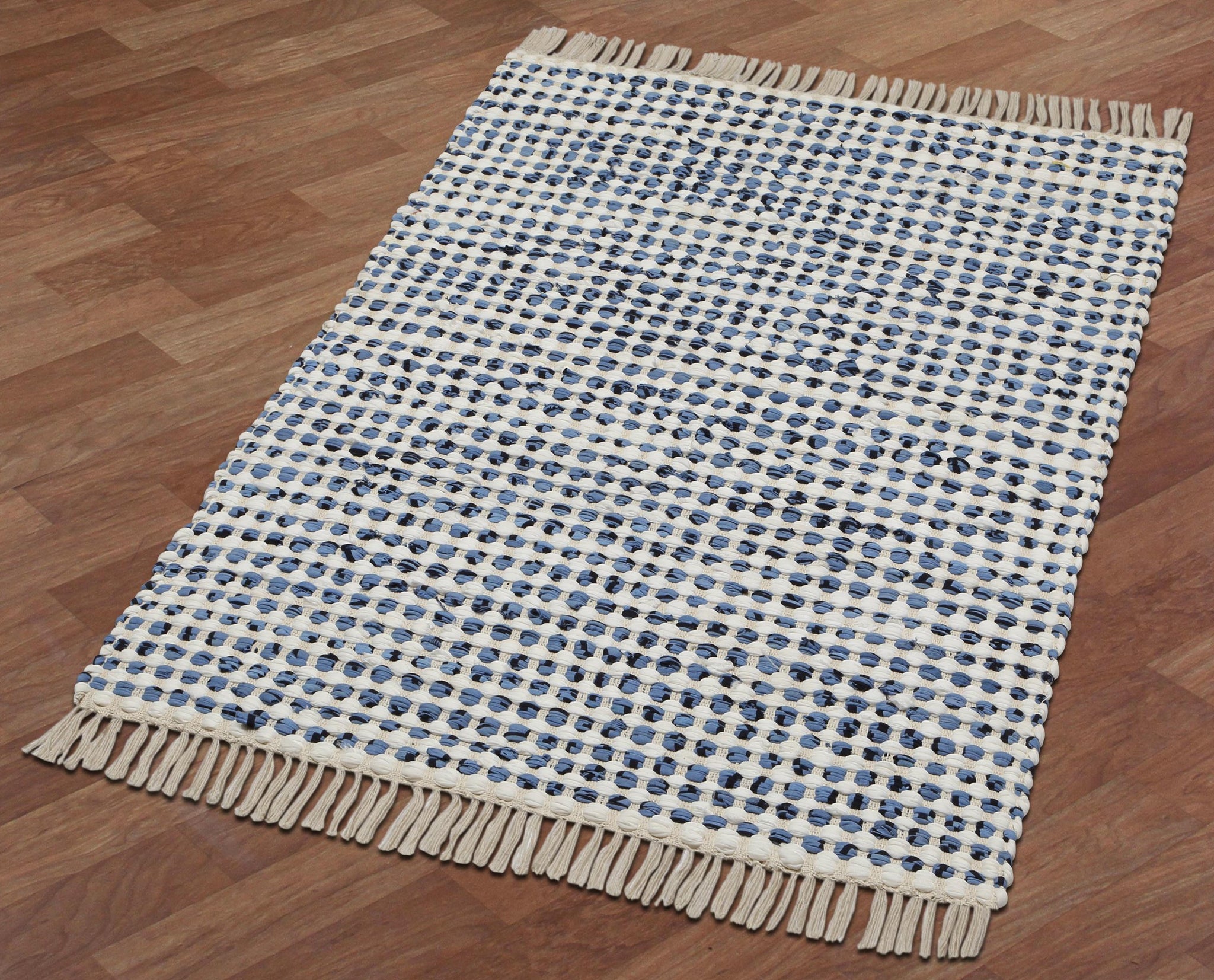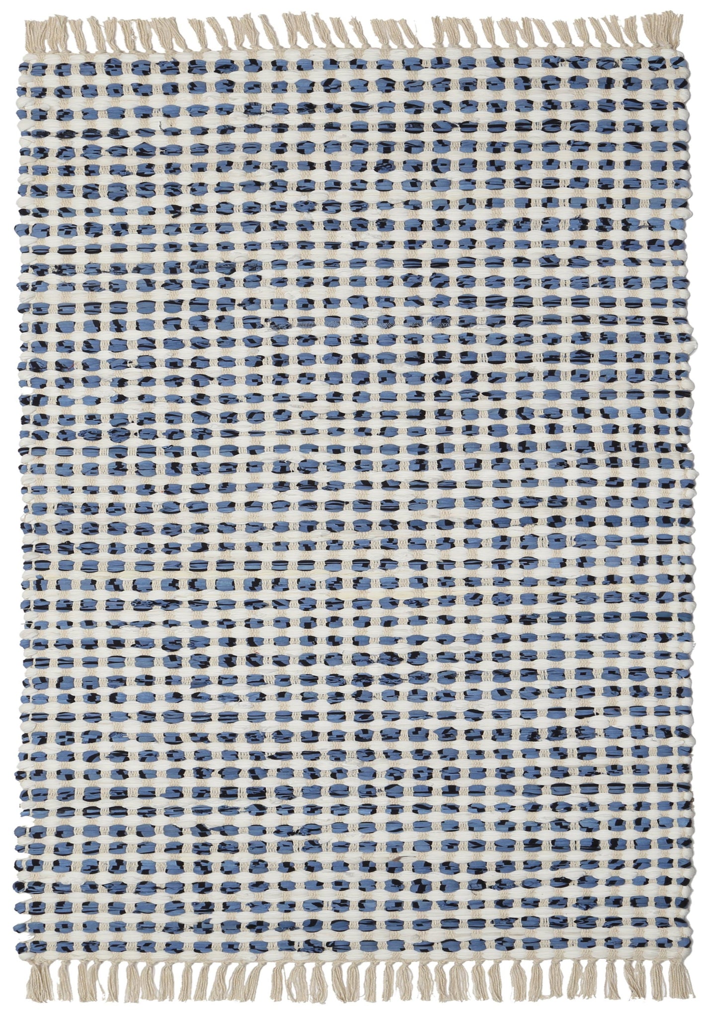 The Complex Collection of rugs is created by weaving super soft cotton ribbon into a sumptuous cotton flat weave foundation. Crafted by hand, artisans weave cotton ribbon through a cotton warp to create a generous weave that is super soft underfoot yet a durable and resilient rug that will lay flat and wear well. With a white base color and intermixed with ribbons of blue /black and bright white, this super soft rug is reversible for twice the wear. This casual contemporary design will add just the right amount of pop of color to enhance any space.